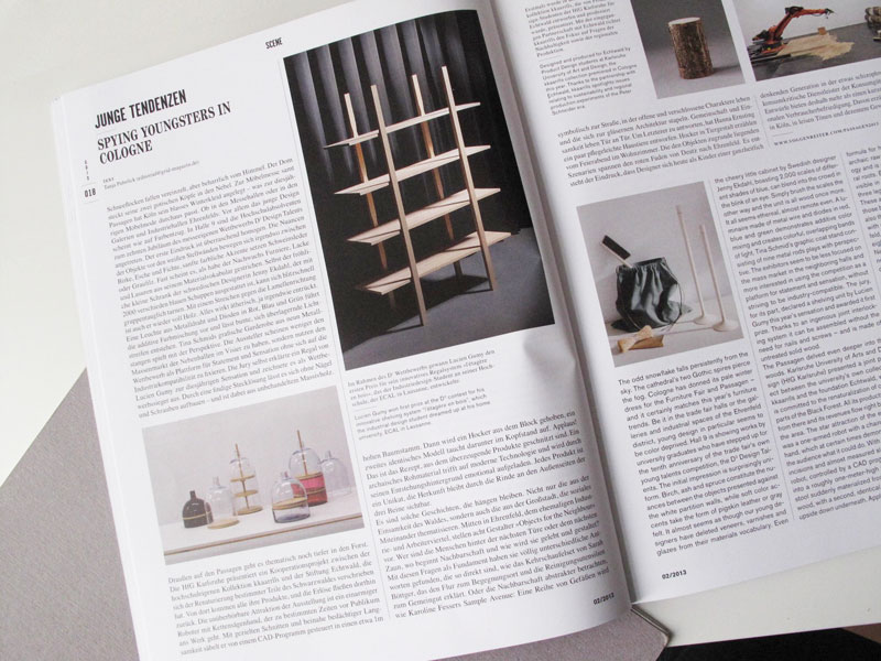 Es sind solche Geschichten, die hängen bleiben. Nicht nur die aus der Einsamkeit des Waldes, sondern auch die aus der Großstadt, die soziales Miteinander thematisieren. Mitten in Ehrenfeld, dem ehemaligen Industrie- und Arbeiterviertel, stellen acht Gestalter „Objects for the Neighbour“ vor. Wer sind die Menschen hinter der nächsten Türe oder dem nächsten Zaun, wo beginnt Nachbarschaft und wie wird sie gelebt und gestaltet? Mit diesen Fragen als Fundament haben sie völlig unterschiedliche Antworten gefunden, die so direkt sind, wie das Kehrschaufel-Set von Sarah Böttger, das den Flur zum Begegnungsort und die Reinigungs-Utensilien zum Gemeingut erklärt. Oder die Nachbarschaft abstrakter betrachten, wie Karoline Fessers Sample Avenue. Eine Reihe von Gefäßen wird symbolisch zur Straße, in der offene und verschlossene Charaktere leben und die sich zur gläsernen Architektur stapeln. Gemeinschaft und Einsamkeit leben Tür an Tür. Um letzterer zu antworten, hat Hanna Ernsting ein paar pflegeleichte Haustiere entworfen. Hocker in Tiergestalt erzählen vom Feierabend im Wohnzimmer. Die den Objekten zugrunde liegenden Szenarien spannen den roten Faden von Deutz nach Ehrenfeld. Es entsteht der Eindruck, dass Designer sich heute als Kinder einer ganzheitlich denkenden Generation in der etwas schizophrenen Lage wiederfinden, konsumkritische Dienstleister der Konsumgüterlandschaft zu sein. Ihre Entwürfe bieten deshalb mehr als einen kurzen Moment der rein funktionalen Verbraucherbefriedigung. Davon erzählen ihre Möbel dieses Jahr in Köln, in leisen Tönen und dezentem Gewand.