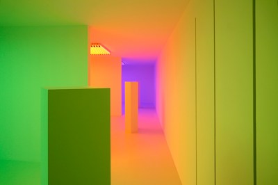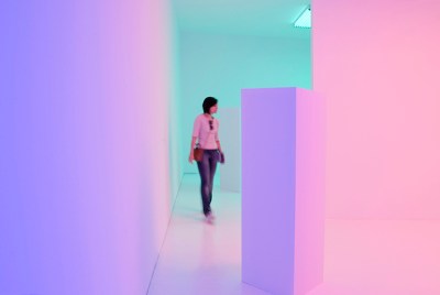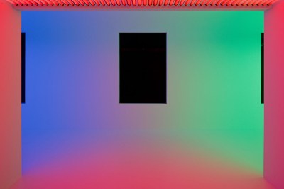 Plötzlich ist alles pink. Der eigene Körper, die Kleidung, die Wände. Die Raumgrenzen verschwimmen, werden von der monochromen Lichtflut weich gewaschen. Dort, wo der dreiseitige Kubus sich öffnet, ändert sich der Spektralbereich. Grün fällt von links ein, Blau von rechts. An der Decke hängen weiße Würfel, deren Seiten sich dem Licht zuwenden. Sie reflektieren das Licht, das die Fläche direkt trifft – und werden zum grün-blauen Akzent im rosa-roten Raum. Wir bewegen uns durch eine Installation aus der Reihe Chromosaturations, die als Teil einer umfassenden Cruz-Diez-Retrospektive in Houston, Buenos Aires, Sao Paulo und Mexico City zu sehen war.