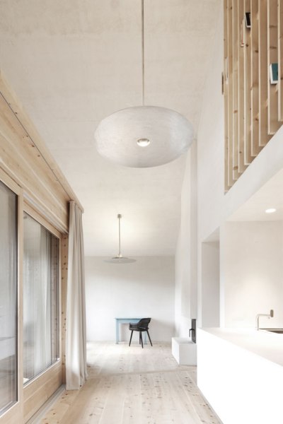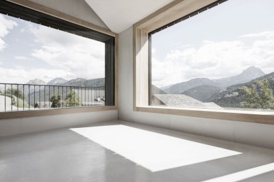 Wer sich auf eine Höhe von 1200 Metern zurückzieht, ist ohnehin nicht unbedingt auf der Suche nach Kommunikation. Einsamkeit, Naturnähe und Entschleunigung werden im Südtiroler Naturpark Fannes-Senges-Prags groß geschrieben – weshalb auch der Entwurf des Büros Pedevilla Architekten als asketischer und einladender Raum der physischen und psychischen Einkehr ausgefallen ist. Obwohl gerade erst fertiggestellt, passt sich das Gebäude in seiner äußeren Erscheinung der umgebenden Typologie an: Die meisten Höfe bestehen hier mit Wohn- und Wirtschaftsgebäude aus zwei Teilen, die beide mit ihrem First zum Tal hin ausgerichtet sind. Balkone gibt es kaum, stattdessen öffnet sich der Wohnraum wie auch bei Pliscia 13 über eine in den Holzmantel integrierte, windgeschützte Loggia dem Bergpanorama.