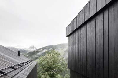 Das fast schwarze Haus mit seinen zwei Giebeln liegt am Hang der Dolomiten – im wortwörtlichen Sinne. Denn Enneberg, die Gemeinde zu der das Projekt dieses Wohnhauses zählt, heißt übersetzt genau das: Jenseits der Berge. Erbaut wurde es nicht mitten im Ort, sondern ganz charakteristisch als Teil eines Weilers, einer Wohnsiedlung mit gerade einmal einer Handvoll Häuser. Kleiner als ein Dorf, ein paar Steine größer als eine Einzelsiedlung. Hier gibt es keine Straßennamen, nur Hausnummern. Das schwarze Haus trägt die Nummer 13, der Weiler heißt Pliscia, eine Postsendung wird schlicht an Pliscia 13 adressiert.