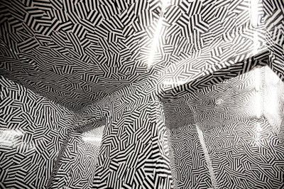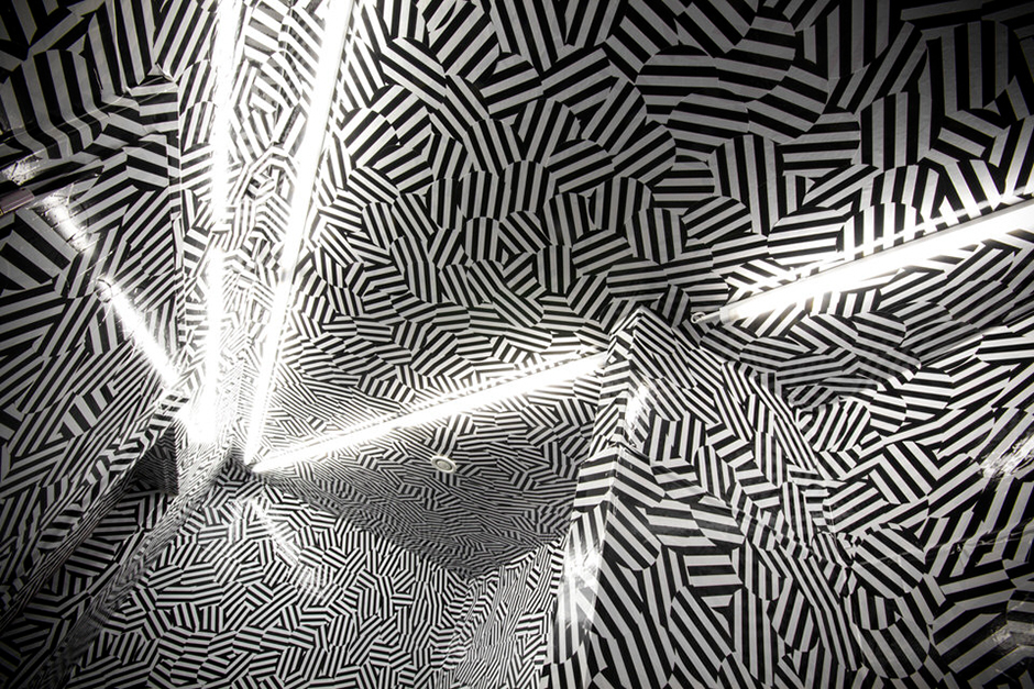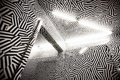 Die Bandbreite dessen, was sich hinter der Waschraumtür verstecken lässt, interessiert Ett La Benn. Deswegen geht es hier nicht immer so monochrom zu wie im konsequent kanariengelben WC des chinesischen Restaurant Yumcha Heroes oder der schwarzen Spiegelwelt des Toca Rouge. Im Friedrichshainer Glory Duck wird der Gast bewusst irritiert. Während der durch eine schräg gestellte Wand offen gestaltete Vorraum zu den Toiletten noch ganz schwarz ist, wartet hinter der nächsten Tür grafische Ausgelassenheit. 13.000 runde, schwarz-weiß gestreifte Sticker bilden die Tapete, verkleiden die Decke und erreichen selbst verborgene Winkel. Ohne klare Kanten und Bezugspunkte verschwimmen die räumlichen Grenzen. Eine Strategie übrigens, die sich im letzten Jahrhundert Militärs bei U-Booten zunutze machten. Von schwarz-weißen Dazzle-Grafiken bedeckt, ließen sich deren Umrisse nicht mehr genau abgrenzen – der Gegner war verwirrt.