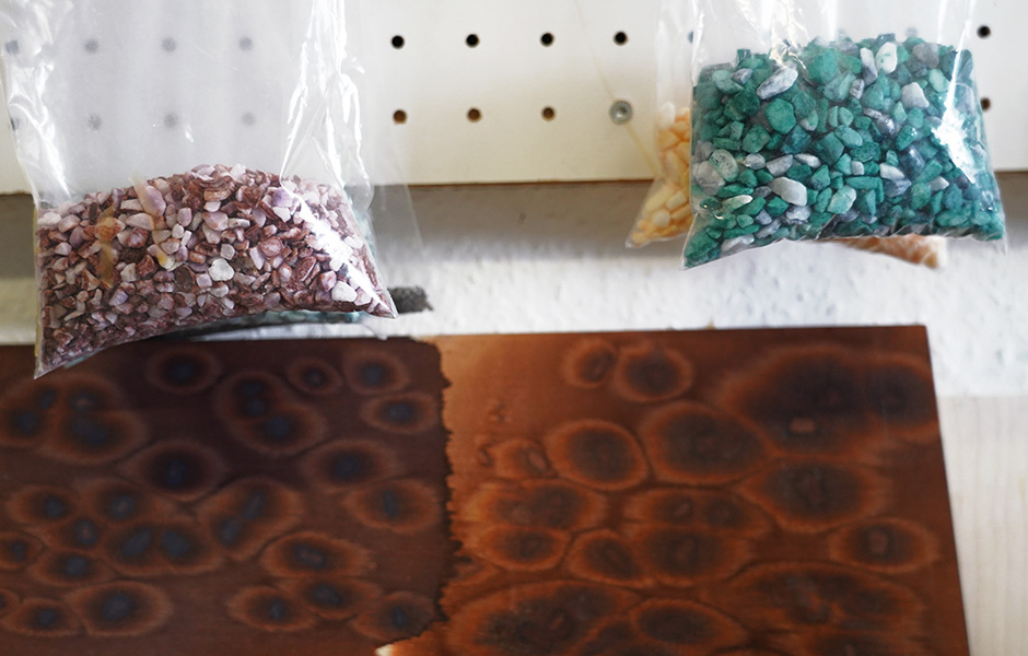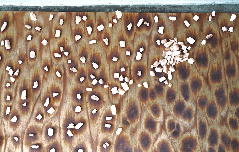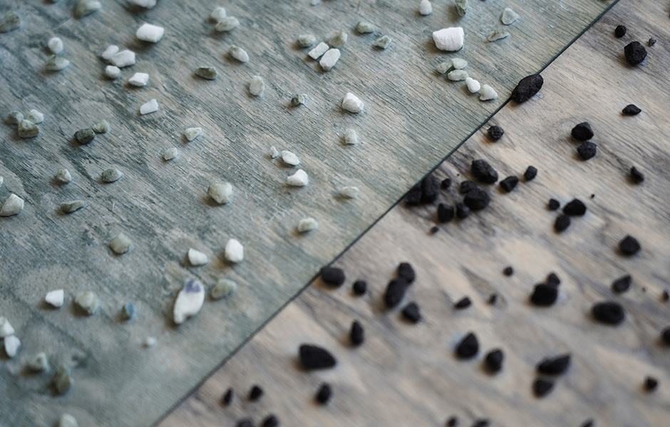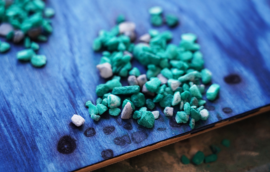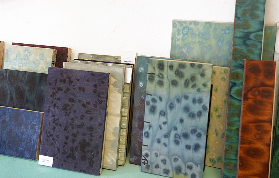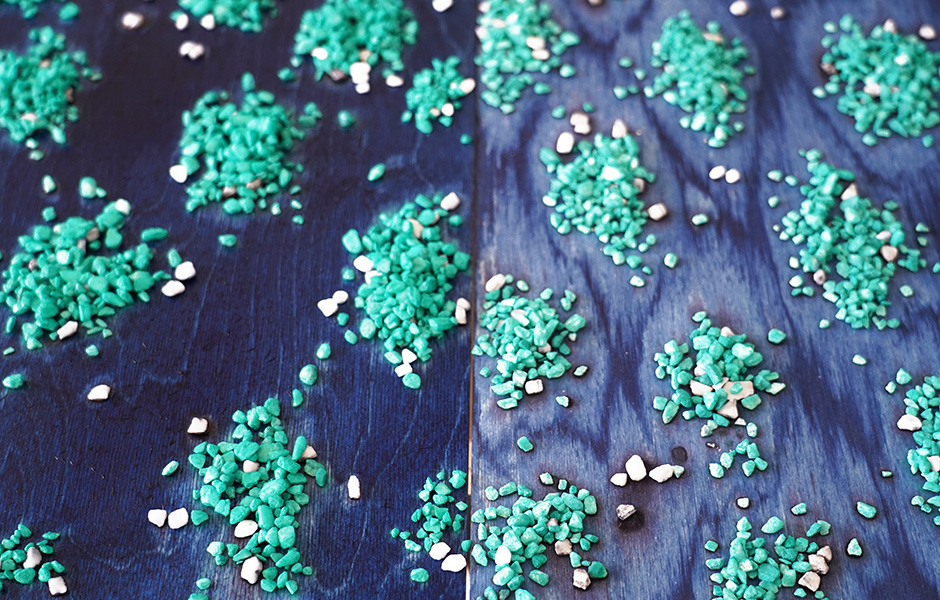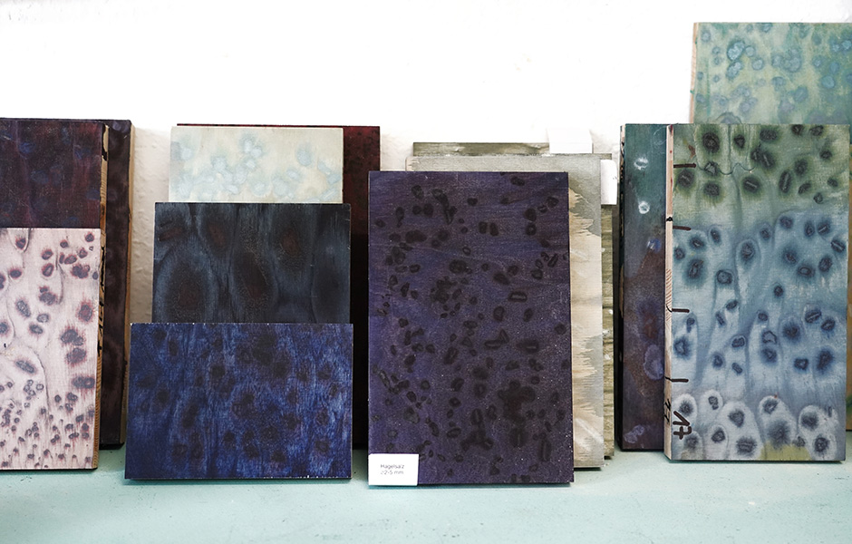 In den Regalen der Werkstatt liegen hunderte von Musterplatten, mal kontrastreich gescheckte Varianten, mal ätherisch monochrome. Daneben aufgereiht Pigmentversuche auf verschiedenen Holzgründen und kleine Beutel voll bunter Salzkristalle. Begonnen hat die Geschichte von Osis vor knapp sechs Jahren. Inspiriert von textilen Färbetechniken wollte llot llov osmotische Verfahren auf Holz übertragen. Dabei nutzen sie die Eigenschaft von Salzkristallen, Wasser zu ziehen. Wenn auf frisch gebeizte Holzflächen Salz aufgebracht wird, saugt es die umgebende Flüssigkeit samt Pigment bis zur Sättigung auf. Die Flächen rund um den Kristall hellen sich wie eine Aureole auf. „Der Prozess selbst ist eigentlich simpel. Komplex machen ihn die Detailentscheidungen: Welches Pigment ich benutze, das Holz, die Körnung des Salzes, optional eingefärbte Kristalle, oder mit welcher Technik ich es aufbringe. Um die unterschiedlichen Effekte zu finden, mussten wir lange experimentieren.“