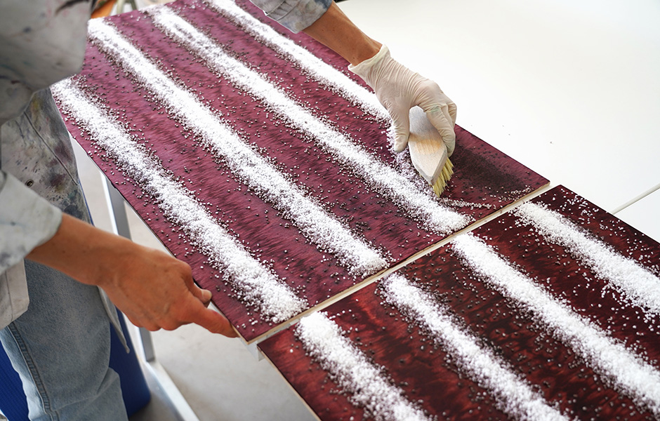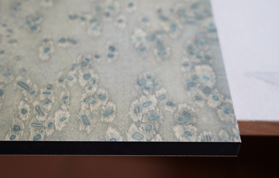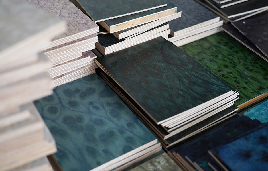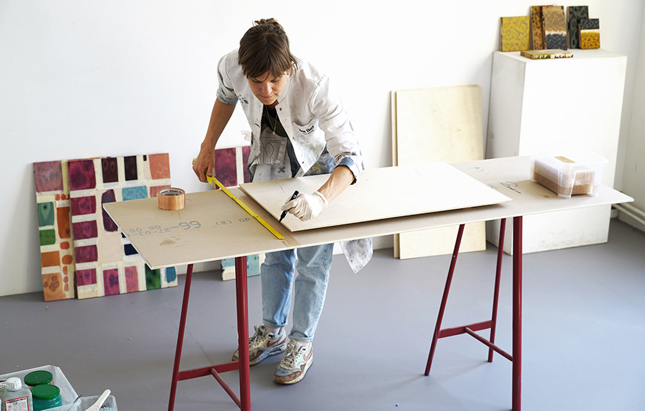 Mal erinnert die Ästhetik an ein zartes, im Regen vergessenes Aquarell, mal an die kräftige Farbenschau eines Pfauenrades. „Mittlerweile verstehen wir den Dialog von Holz und Salz intuitiv“, stellt Ania Bauer fest. Die eigene Expertise bedeutet aber auch, dass die Produktion aufgrund ihrer handwerklichen Ausdifferenzierung nicht einfach an Dritte abgegeben werden kann. Jede Rohplatte wird im Studio gefertigt, die Veredelung erfolgt in einer spezialisierten Holzwerkstatt. Dadurch ist die Zusammenarbeit mit den Kunden und Partnern unmittelbar, Varianten können direkt getestet und besprochen werden, bevor die Produktion erfolgt. Ein Verfahren, dass sich gerade unter den aktuellen Umständen als großer Vorteil erweist. „Wir arbeiten mit Osis hyperlokal. Die Platten gehen vom Studio in die Holzwerkstatt und dann zum Projekt. Wenn das in Berlin liegt, muss die Stadtgrenze im Produktionsverlauf im Prinzip nicht gekreuzt werden.