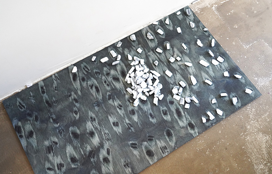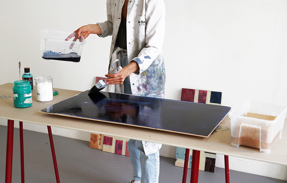 In einem Raum des Studios stapeln sich Farbeimer und Materialien, es liegt der Geruch von frisch gesägtem Holz in der Luft. Eine typische Designwerkstatt, wären da nicht die riesigen Säcke mit unterschiedlichen Salzen, die mitten im Raum stehen. Vor einigen Jahren haben llot llov mit Osis eine Oberflächengestaltung für Holz entwickelt, die sich üblichen Kategorisierungen entzieht: Sie ist kein Produkt, kein Möbel, keine Raumlösung. Llot llov entwirft auf Nachfrage mit dem Material zwar individuelle Schreibtische oder Regale, die auch in Editionen aufgelegt werden. Meistens verlässt Osis das Studio aber als Plattenware, bestellt wird es vor allem von Architekten und Objektausstattern, die Entwürfe ihrer Einbauten direkt an llot llov schicken. „Eines der letzten besonderen Projekte war die Villa Kellermann, das neue Restaurant von Tim Raue in Potsdam“, sagt Ania Bauer. „Ester Bruzkus hat das Interieur entworfen – und das Mobiliar teilweise aus Osis-Platten fertigen lassen.“